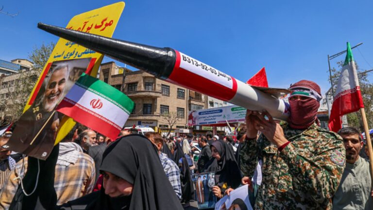 Iranians attend the funeral procession for seven Islamic Revolutionary Guard Corps members killed in a strike in Syria, which Iran blamed on Israel, in Tehran on April 5, 2024.