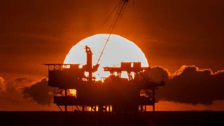 An offshore oil platform is seen at sunset near Huntington Beach, California, on Feb. 9, 2024.