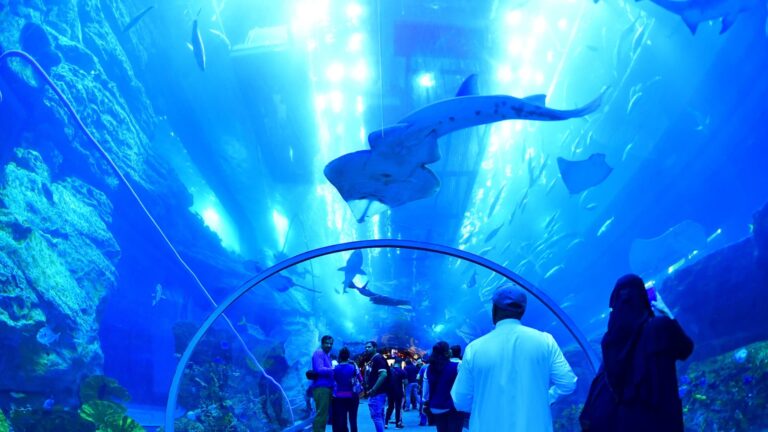 The record-breaking Dubai Mall is also home to the world’s largest shopping mall aquarium, where visitors can cage snorkel and dive with sharks.