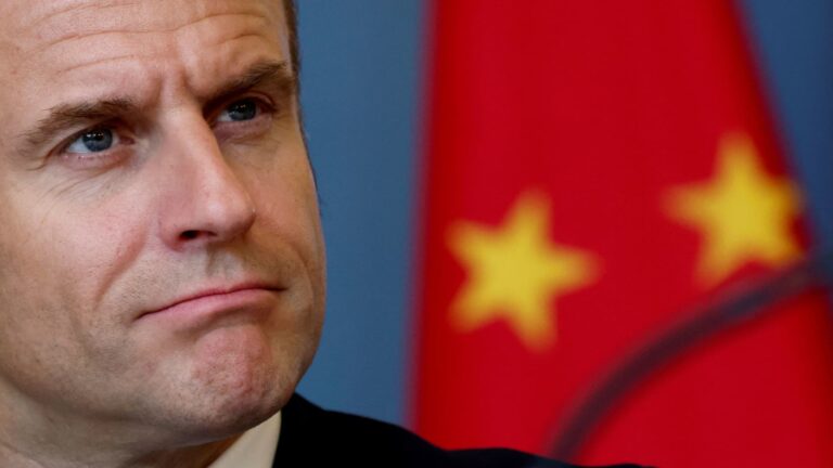 French President Emmanuel Macron attends a trilateral meeting with China’s President Xi Jinping and European Commission President Ursula von der Leyen (not seen) at the Elysee Palace in Paris as part of the Chinese president’s two-day state visit in France, May 6, 2024.