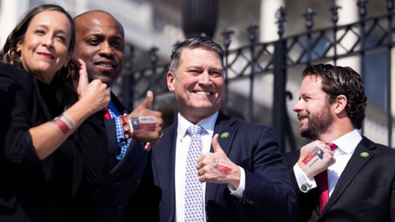 From left, Reps. Monica De La Cruz, R-Texas, Wesley Hunt, R-Texas, Ronny Jackson, R-Texas, and Dan Crenshaw, R-Texas, display Texas temporary tattoos to mark Texas Independence Day, which in on March 2nd, on the house steps of the U.S. Capitol after the last votes of the week on Wednesday, March 1, 2023.