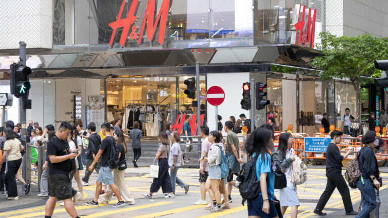 Pedestrians cross the street in front of a H&M store in Hong Kong.