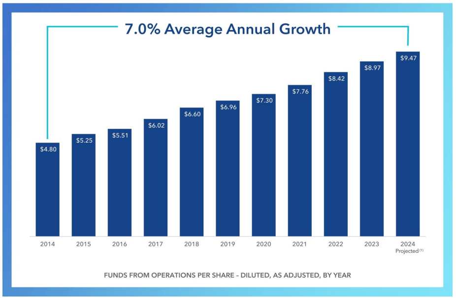 Given its portfolio of high-quality tenants, Alexandria Real Estate Equities has been able to consistently collect all of its owed rents (rent collection of 99.9% in 1Q24) and grow its funds from operations. The trust produced 7% FFO growth per annum since 2014 and the forecast is bullish also.