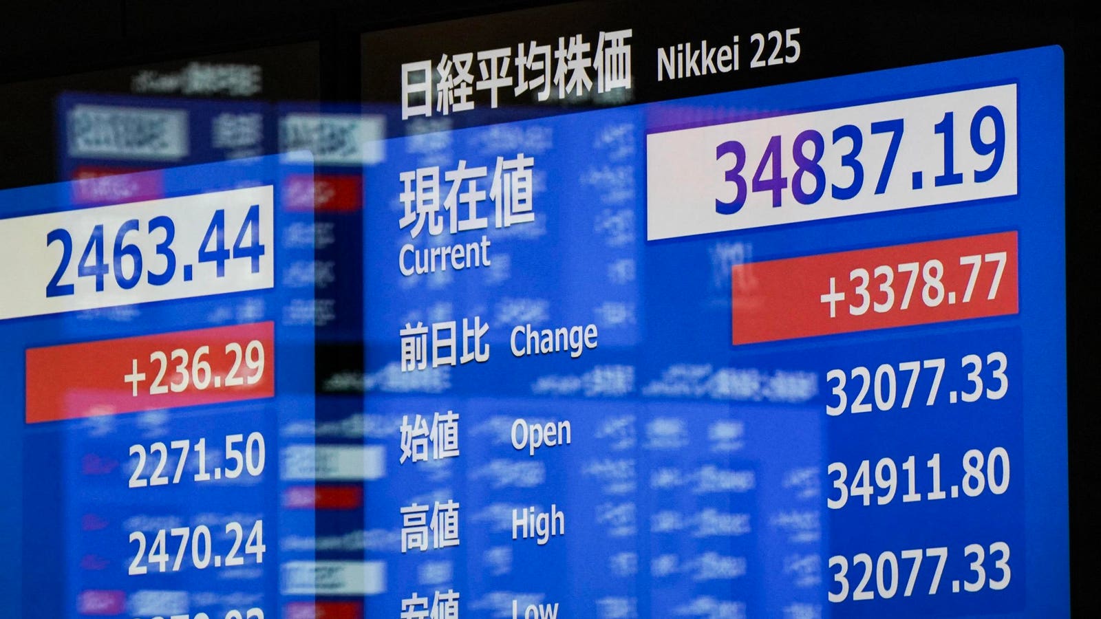 Japan’s Nikkei 225 index surged more than 10% on Tuesday to 34,675 points while the Tokyo Stock Price Index (TOPIX) was up by 8.2%.