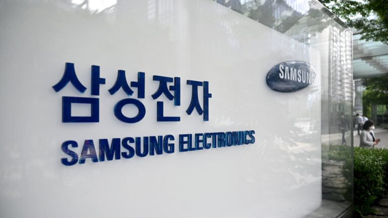 People walk past the logo of Samsung Electronics in Seoul on July 7, 2022. South Korea’s Samsung Electronics Co Ltd turned in its best April-June profit since 2018 on Thursday, underpinned by strong sales of memory chips to server customers even as demand from inflation-hit smartphone makers cools.