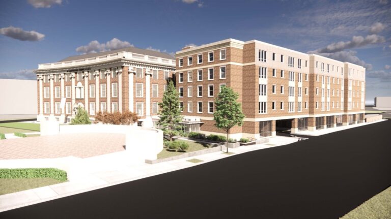 The WinnDevelopment effort will employ adaptive reuse techniques to preserve and renovate the 94-year-old building as 16 apartment homes and a variety of community spaces, while erecting a new five-story apartment building alongside it to house 64 new apartments. The two buildings will be connected on the ground floor by a single-story glass walkway.