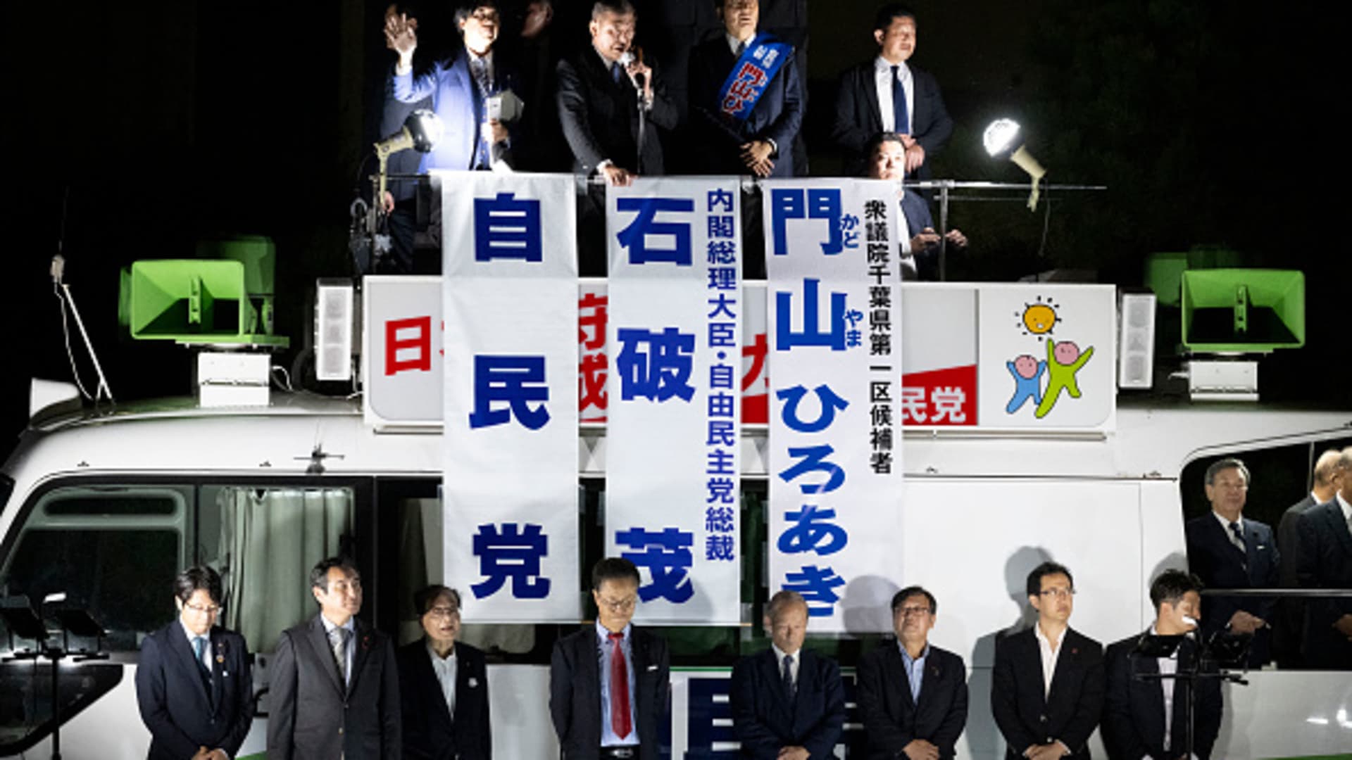 Japan’s Prime Minister Shigeru Ishiba (top C) delivers an election campaign speech in support of the Liberal Democratic Party candidate in Chiba on October 19, 2024.
