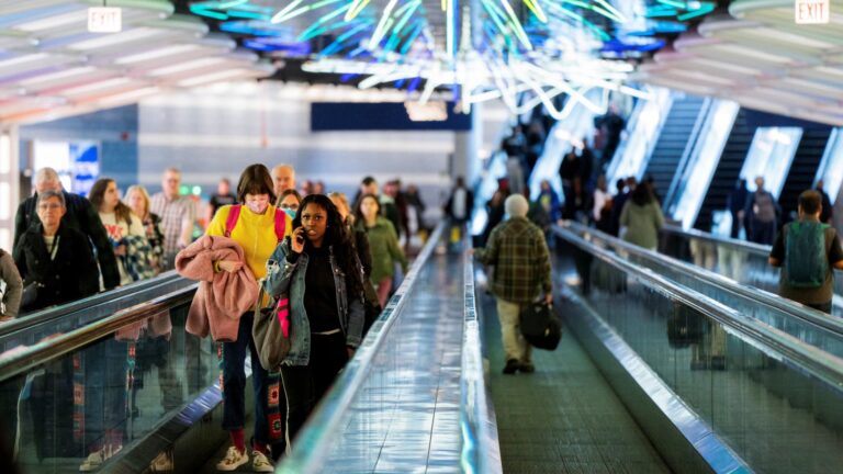 People wait in line for security checkpoints ahead of the Thanksgiving holiday at O’Hare International Airport in Chicago, Illinois, U.S. November 22, 2023.