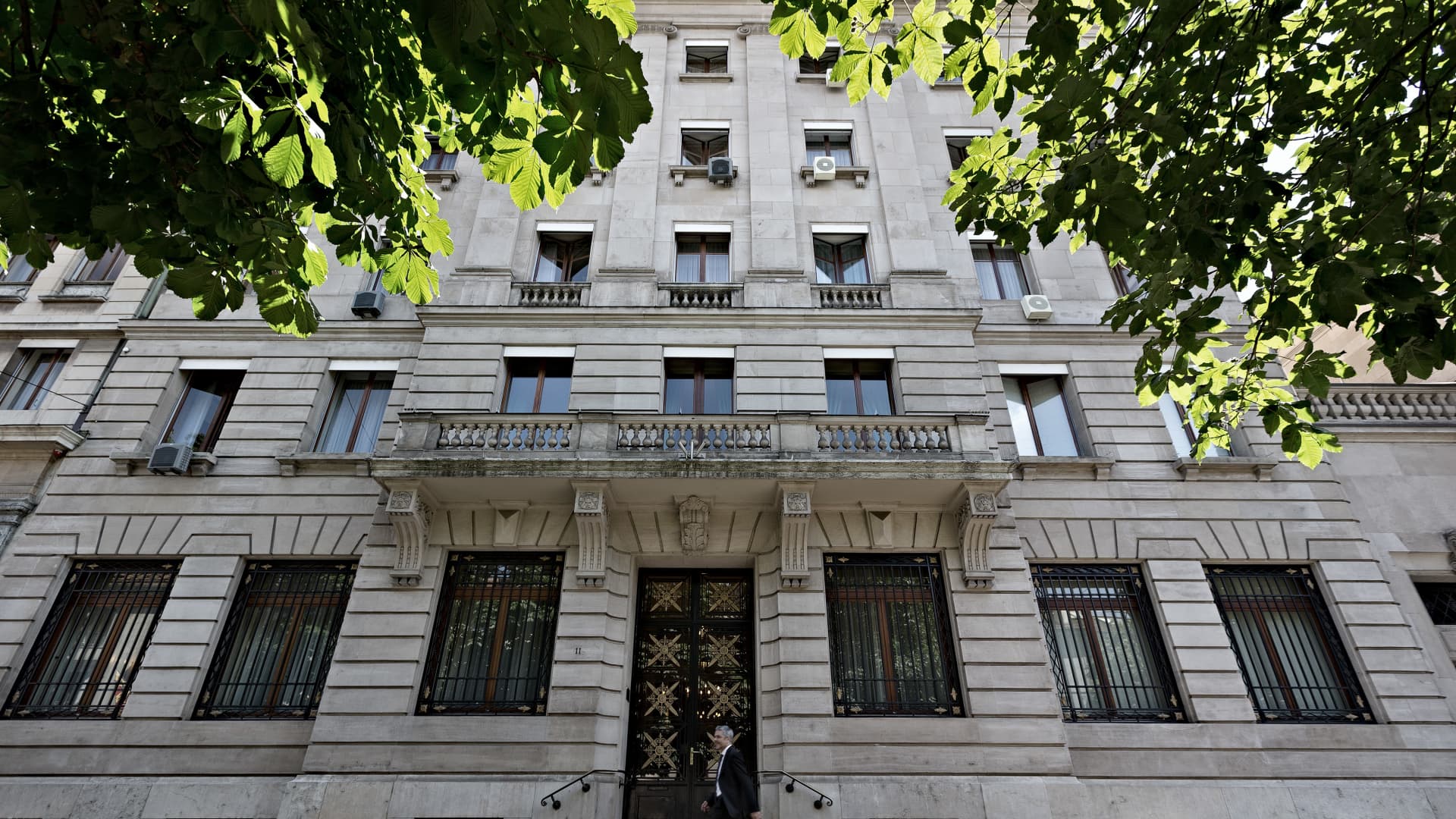 A pedestrian walks by the entrance to Lombard Odier in Geneva, Switzerland.