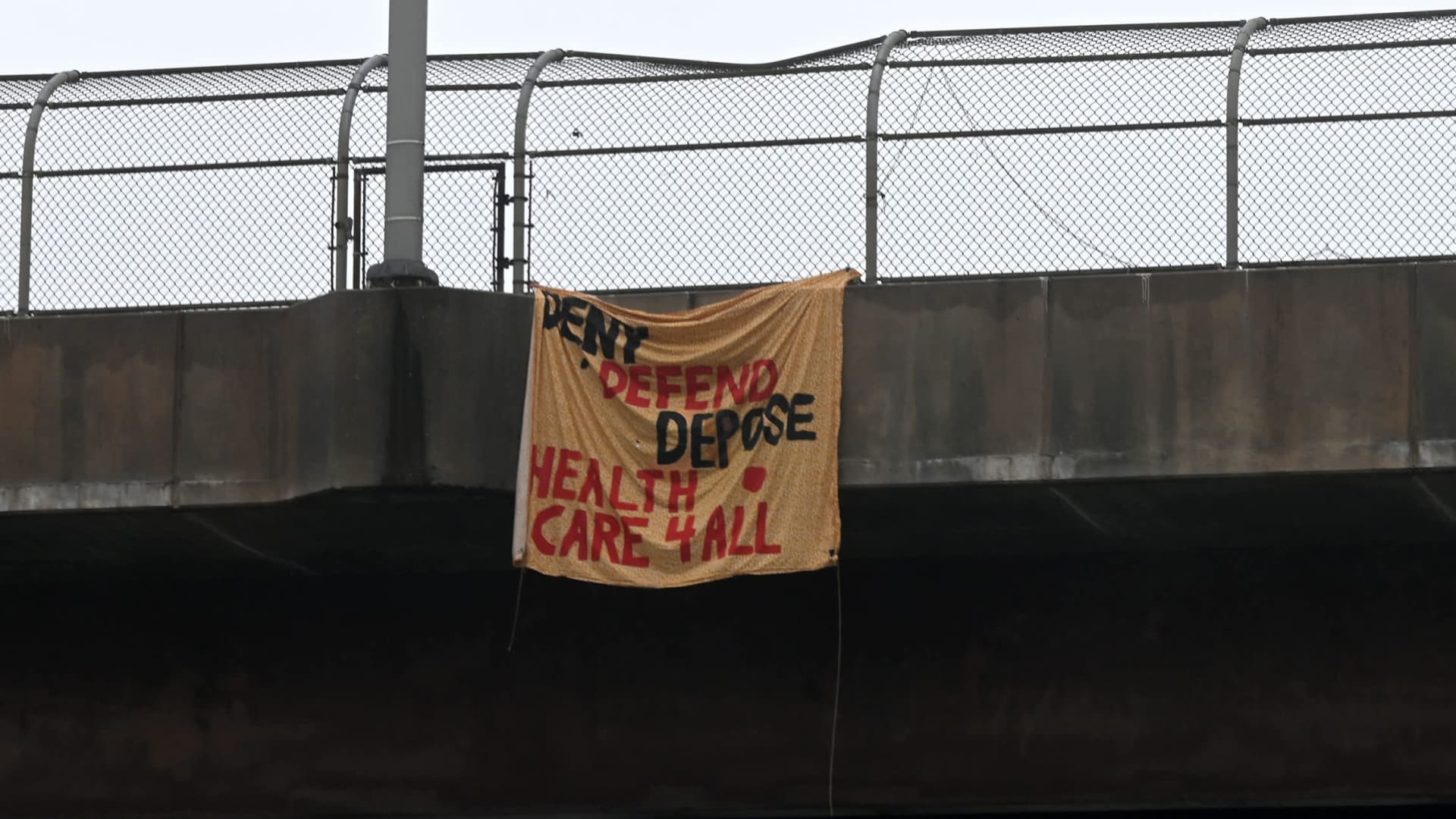 A banner hanging from on overpass along the southbound lane of I-83 that says, “Deny Defend Depose Health Care 4 All.”