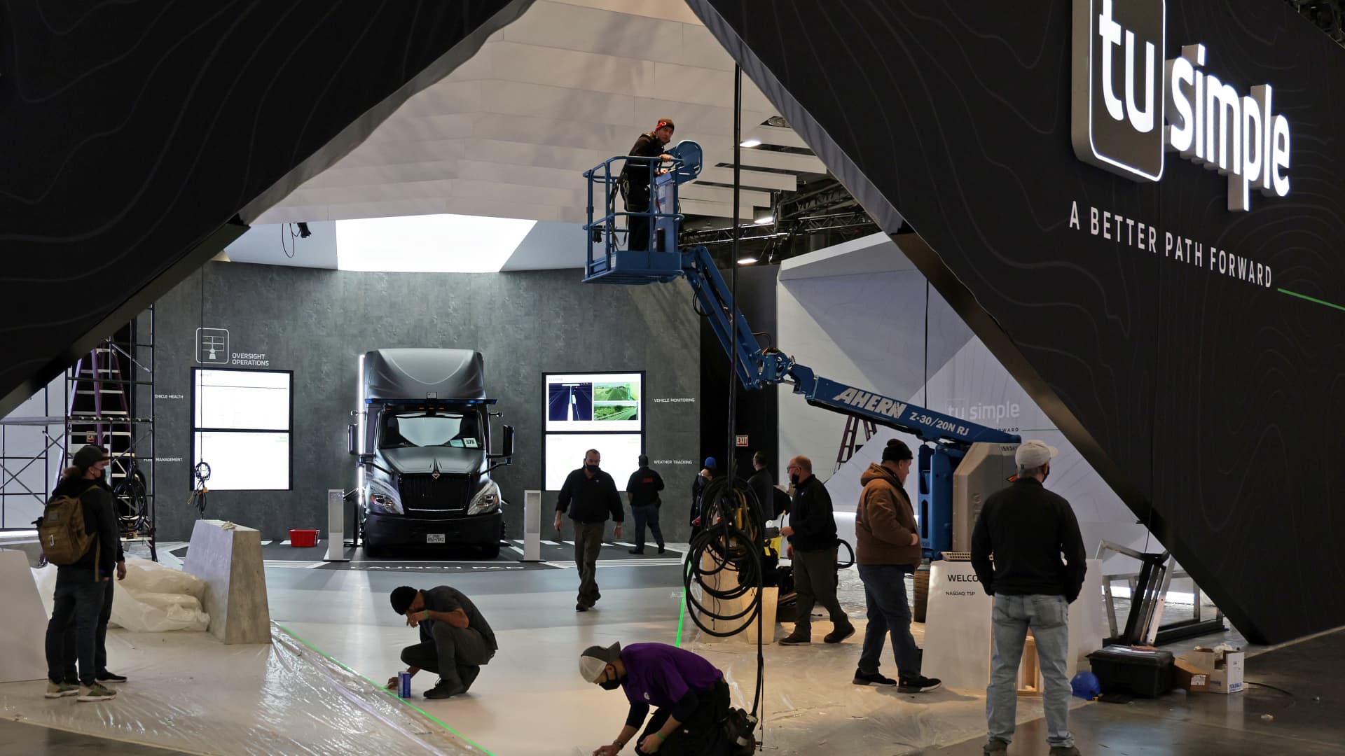 Workers setting up the TuSimple booth for CES 2022 at the Las Vegas Convention Center on Jan. 3, 2022.