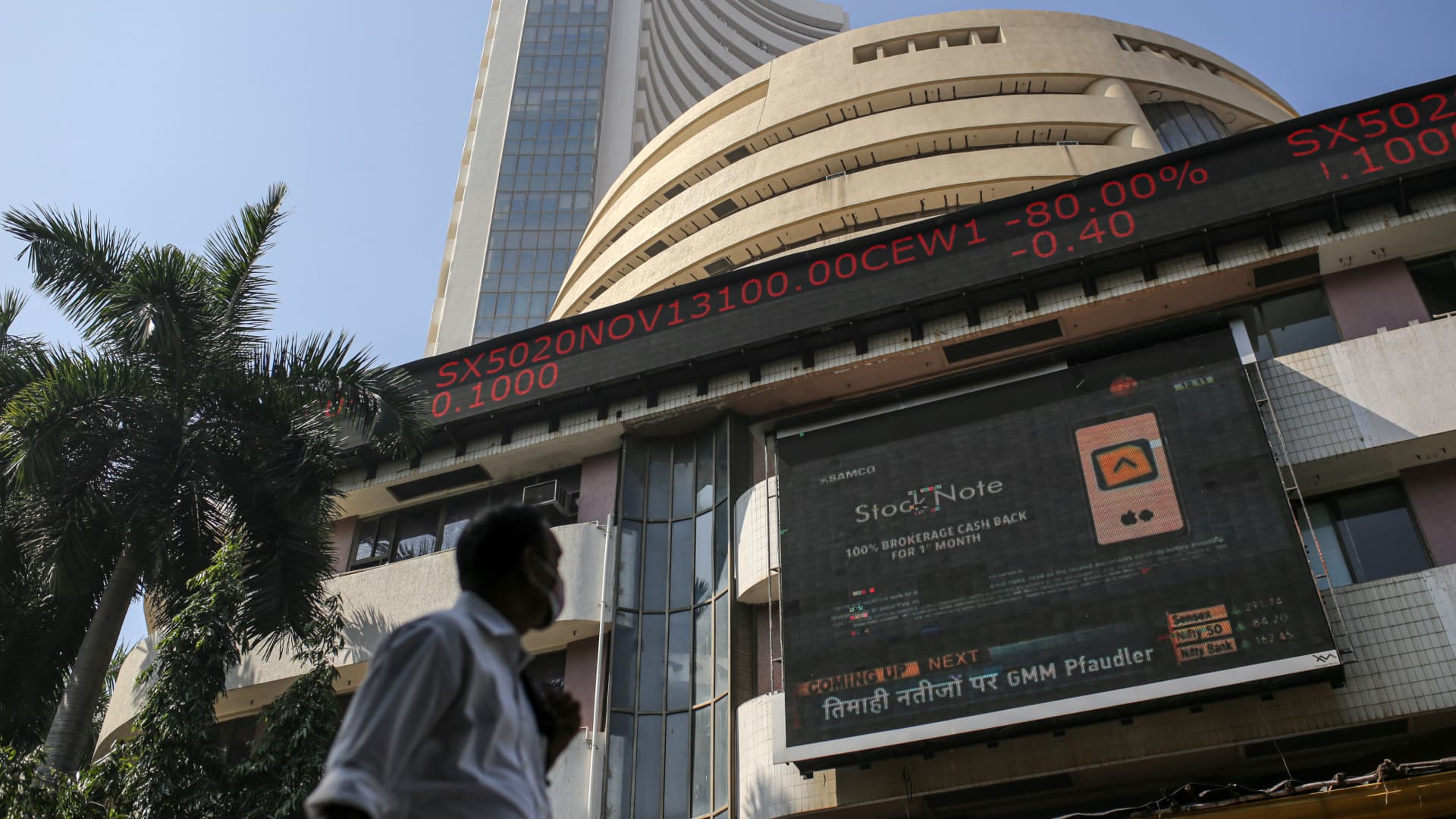 A pedestrian wearing a protective mask walking past the Bombay Stock Exchange (BSE) building in Mumbai, India. The Nifty 50 and Sensex recently slid to their lowest in more than six months