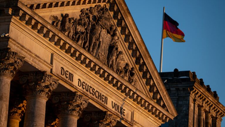 The evening sun shines on the Reichstag building of the German Bundestag with the inscription “Dem Deutschen Volke.