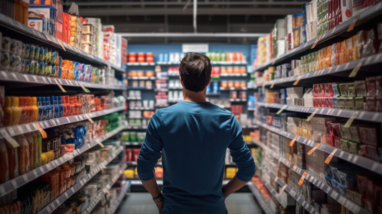 A shopper browsing through a discount retailers merchandise aisle filled with a wide variety of items.