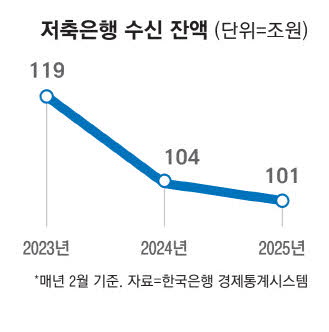 According to the Bank of Korea’s economic statistics system, the total receivable balance of savings banks has steadily decreased to 100.5769 trillion won as of February, putting 100 trillion won on the verge of collapse. It fell 15.4% from 118.9529 trillion won two years ago, down more than 18 trillion won.