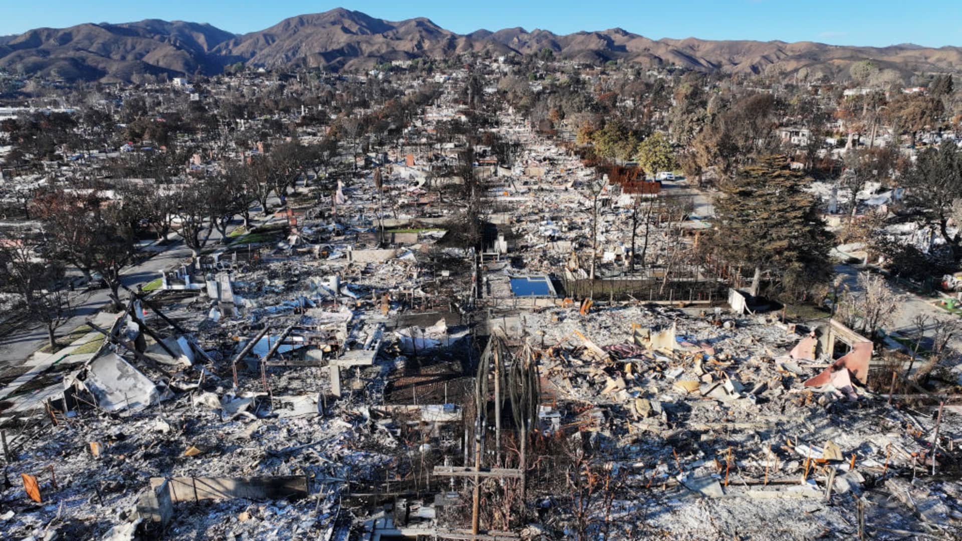 An aerial view of homes destroyed in the Palisades Fire on January 27, 2025 in Pacific Palisades, California.