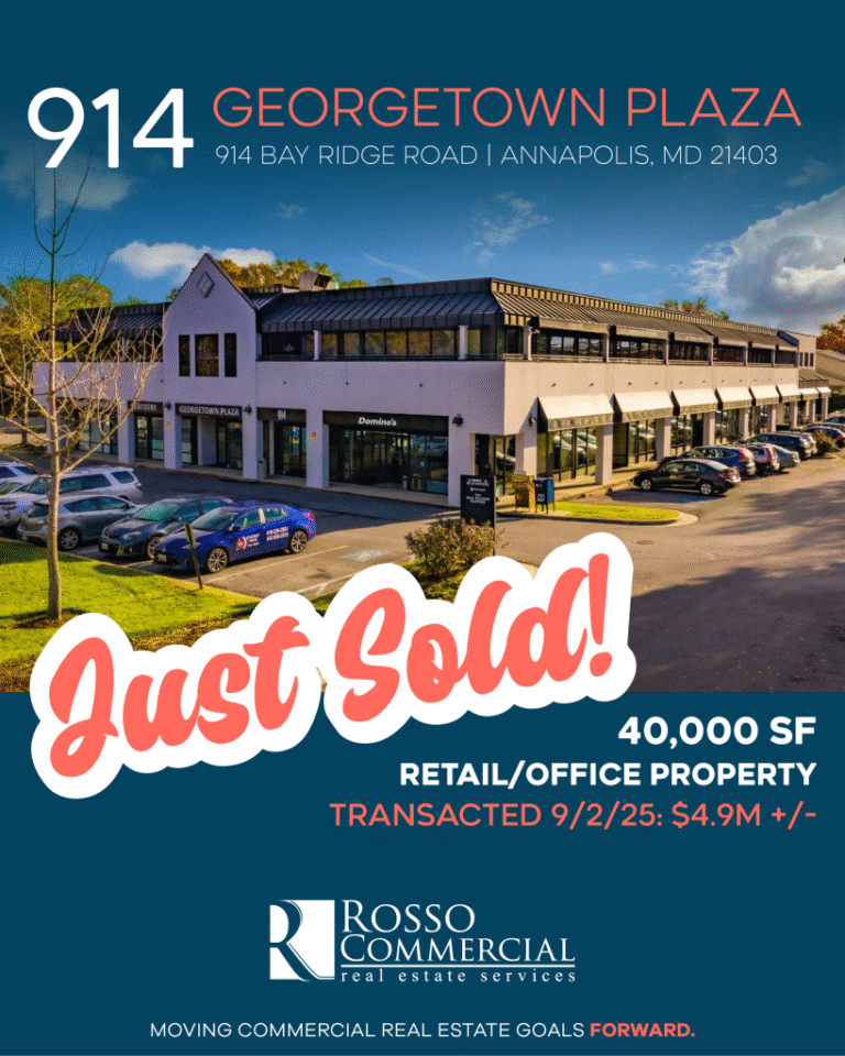 Rosso Commercial Real Estate is pleased to announce the sale of Georgetown Plaza, a 40,000± square foot, two-story mixed-use property located at 914 Bay Ridge Road in Annapolis, Maryland, for approximately $4.9 million. The transaction officially closed August 29, 2025, marking the first change in ownership in decades for this long-standing neighborhood center.