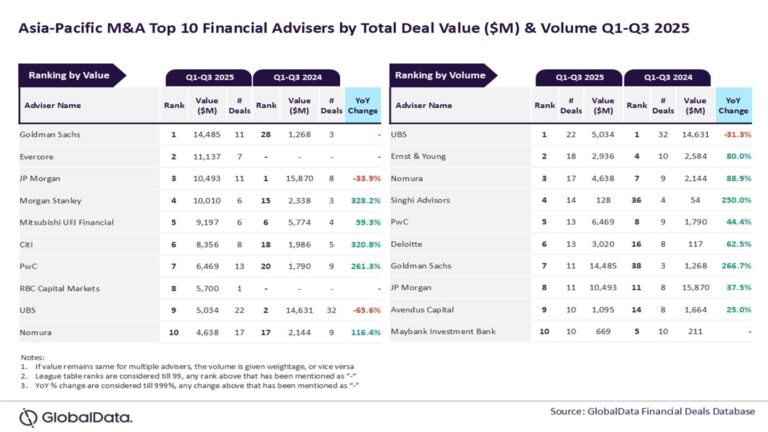 GlobalData lead analyst Aurojyoti Bose said: “UBS was the top adviser by volume during Q1-Q3 2024 and despite registering a year-on-year decline, it retained the leadership position by this metric during Q1-Q3 2025. Apart from leading volume, UBS also occupied the ninth position by value during Q1-Q3 2025.