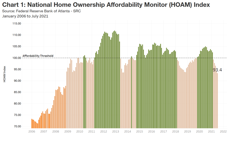 With a 93.4 rating in July, the Federal Reserve Bank of Atlanta’s Home Ownership Affordability Monitor (HOAM) index fell to its lowest level since 2008 (see chart 1). A HOAM index reading below 100 is an indication that a median-income household cannot absorb the costs of owning a median-priced home on the market. The HOAM index has remained below 100 since March. Over the past year, US home ownership affordability dropped 11.1 percent as home prices sustained upward movement. Although the pace of home price growth has lessened, the median existing home sales price tag continues to increase, reaching a record $342,350 (three-month moving average) in July, according to data tracker CoreLogic. Despite still low 30-year fixed mortgage rates, the median-income US household would need to spend 32.1 percent of its annual income to own the median-priced home, above the 30 percent affordability threshold recommended by the federal Department of Housing and Urban Development.