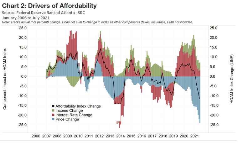 Historically low interest rates remain the primary driver of housing demand. Improving wage growth as the economy emerges from the coronavirus pandemic has helped households that are considering purchasing a home. However, for a growing share of those looking to purchase a home, rising home prices have erased the benefits of low rates and wage growth. (see chart 2).