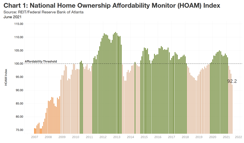 With a 92.2 rating in June, the Federal Reserve Bank of Atlanta’s Home Ownership Affordability Monitor (HOAM) index fell to its lowest level since 2008 (see chart). The index fell below 100 in March and has remained there. A reading below 100 indicates that a median-income household can no longer afford to own a median-priced home on the market. Over the past year, the index shows that US home ownership affordability dropped by 11.9 percent as prices soared. In June, median existing home sale prices rose above a record $340,000 (three-month moving average), according to data provider CoreLogic. This valuation represents a 23.8 percent increase over the past 12 months, one of the highest year-over-year price gains on record. Even with relatively low 30-year fixed interest rates (2.87 percent in August), a median-income household would spend 32.6 percent of its annual income to own a median-priced home, which is above the 30 percent affordability threshold set by the US Department of Housing and Urban Development.