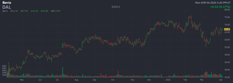 DAL is looking to score its third gain in the last four sessions and is fresh off its fourth-straight weekly win, but also just marked its first quarterly loss since March 2025. The shares recently slipped below their year-to-date breakeven and have shaved 12% off their Feb. 11 record high of $76.39, though longer term they still sport an 80.8% year-over-year lead.